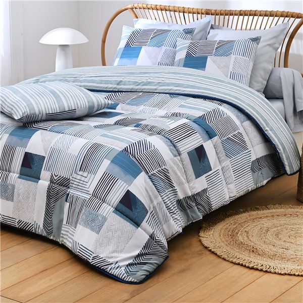- Enveloppe microfibre 100 % polyester, 1 face motifs géométriques / dos motif rayures.