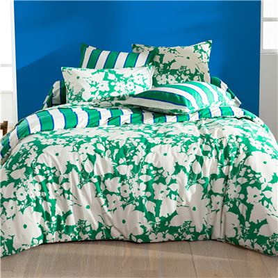 Et pour changer de décor, adoptez la polyvalence du double-face ! Le recto, fleuri, est dynamisé par l'élégant volant de 2 cm sur les taies. Le verso joue la carte graphique avec de belles rayures vertes et bleues sur fond écru. Vous pouvez ainsi moduler le style de votre lit en un clin d’œil, du drap-housse à la housse de couette, pour un décor plein de vitalité.