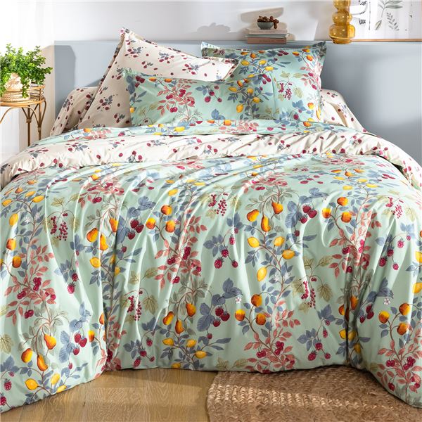 - Motif principal fruits sur fond vert : drap plat, recto des taies d'oreiller, recto de la housse de couette.