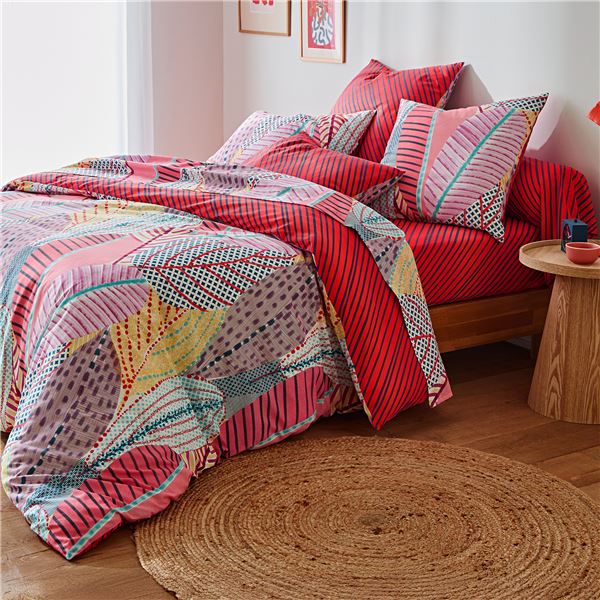 - Motif principal grandes feuilles multicolores : drap plat, recto des taies d'oreiller, recto de la housse de couette.