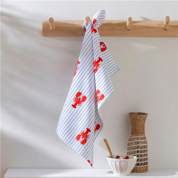 Apportez un souffle de fraîcheur océanique à votre intérieur avec ce magnifique lot de torchons en 100% coton. Ce duo complémentaire allie parfaitement esthétique et praticité : l'un arbore un imprimé homards rouge vif sur de fines rayures bleues, tandis que l'autre propose une texture en nid-d'abeilles uni bleu profond, reconnue pour son pouvoir d'absorption supérieur et son séchage rapide.